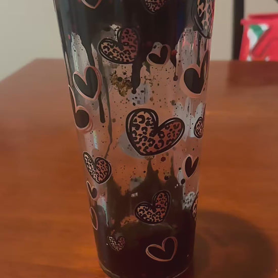 Slow-drip black lava with a glossy finish and leopard heart details—because not everything needs to rush. This handmade tumbler moves at its own pace, creating a moody, mesmerizing drip that hits different.