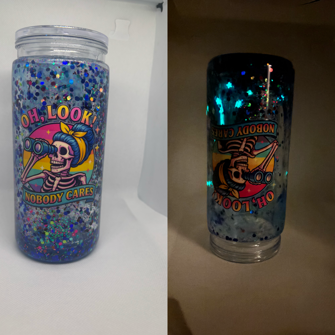 Blue mica lava, glow-in-the-dark stars, and holographic middle finger glitterโbecause subtlety was never the goal. This 16oz handmade tumbler shines by day and lights up at night with unapologetic, unbothered energy.