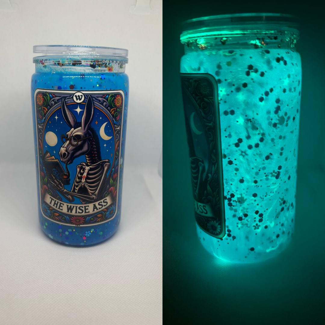 This handmade tumbler lights up when the lights go down, bringing bold glow and main-character energy to every sip. Featuring The Wise Ass design, it’s smart, sarcastic, and impossible to ignore.